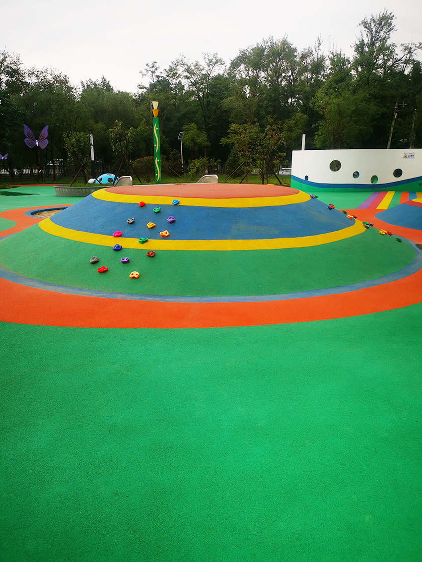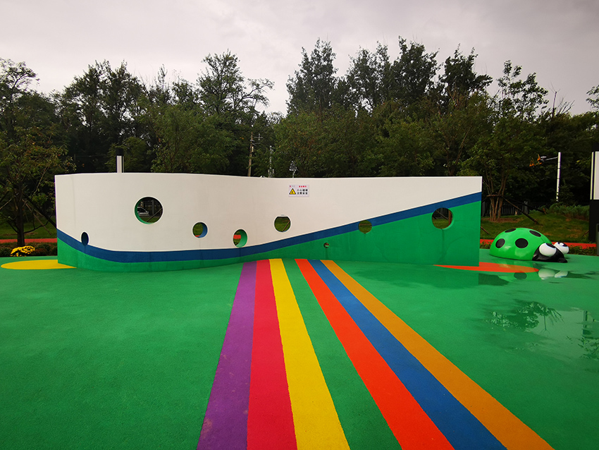 七彩橡胶广场与景观墙组合在一起,是孩子们玩耍的地方。